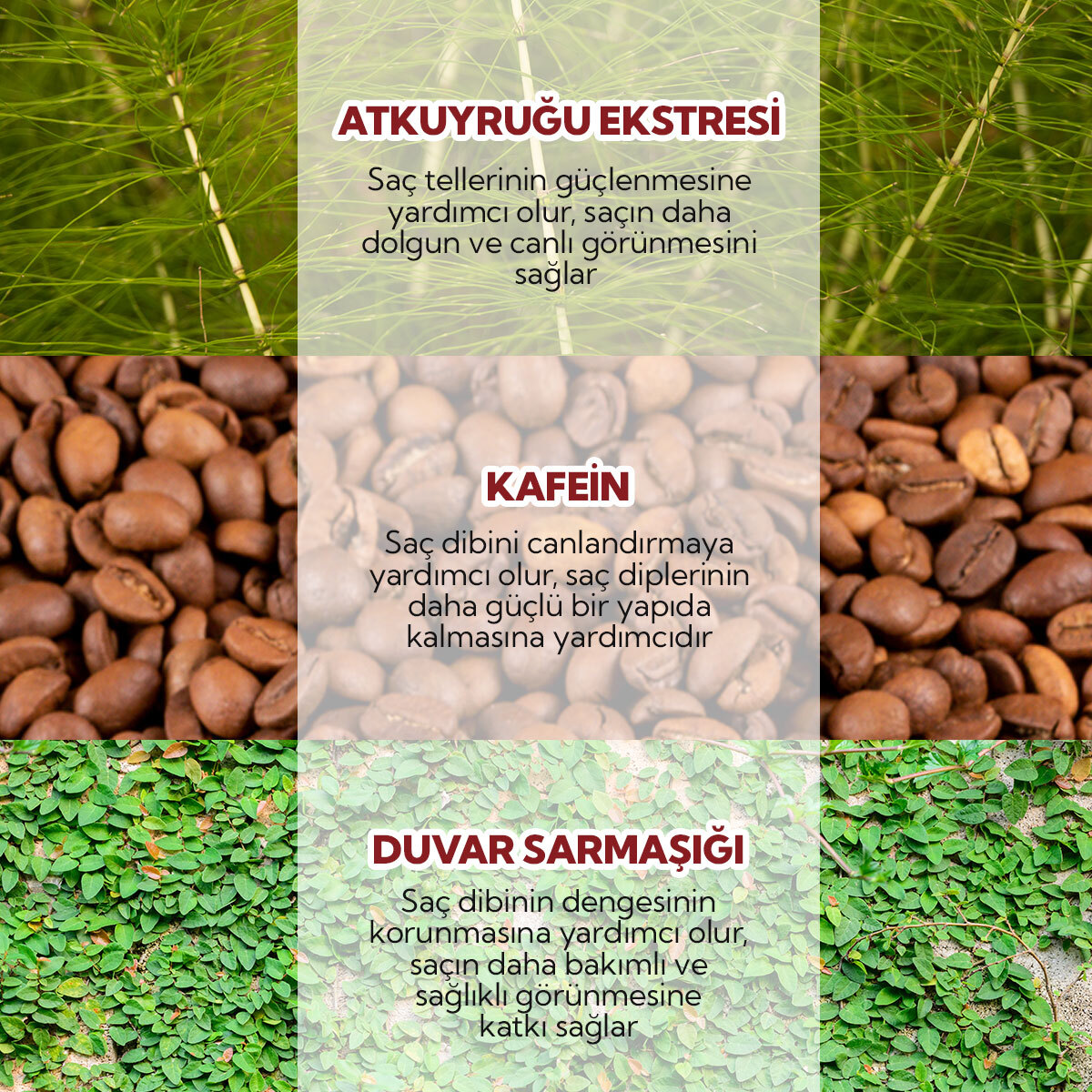 Kafein ve ısırgan otu ekstresi saç dökülmesini azaltmaya yardımcı olur. At kuyruğu ekstresi ile birlikte saç tellerini güçlendirir. Saçın bakımlı uzamasına yardımcı olur.