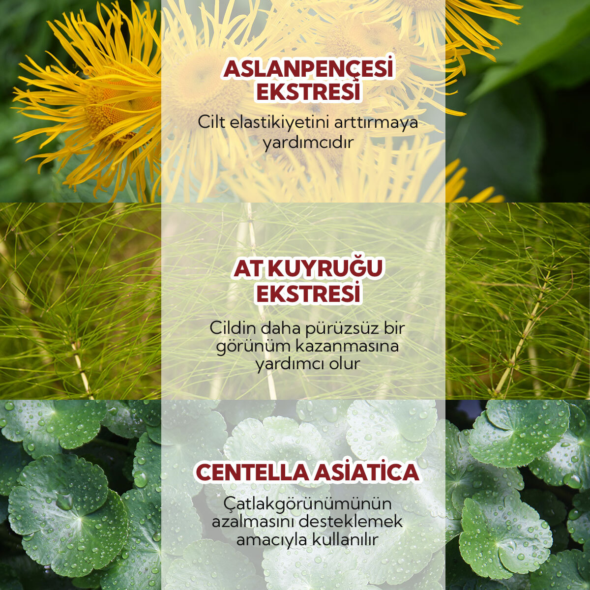 Atkuyruğu, aslanpençesi, duvar sarmaşığı, soğan ve gotu kola (cica) ekstreleri sayesinde cildin esnekliğini korumaya ve pürüzsüz bir görünüm kazandırmaya yardımcı olur.