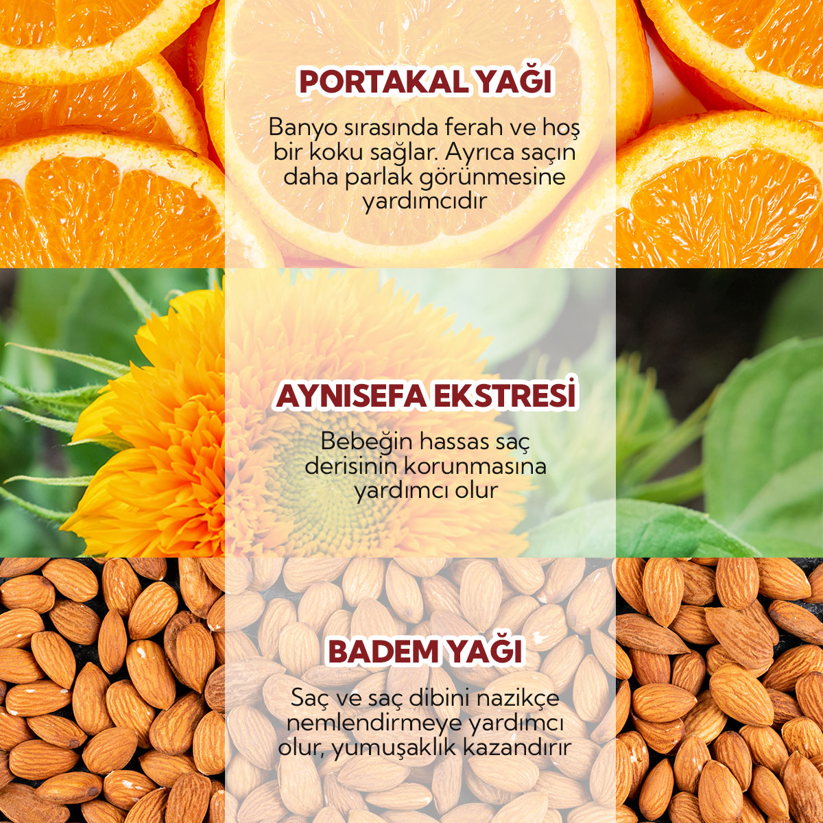 | Ana Fayda | Bebeklerin saçını ve vücudunu temizlemek için özel olarak geliştirilmiştir. | Cilt elastikiyetini arttırmaya,nemlendirmeye ve yumuşatmaya yardımcıdır. | Cilt elastikiyetini arttırmaya yardımcıdır. | Bebeklerin cildini beslemeye ve nemlendirmeye yardımcı olur. |