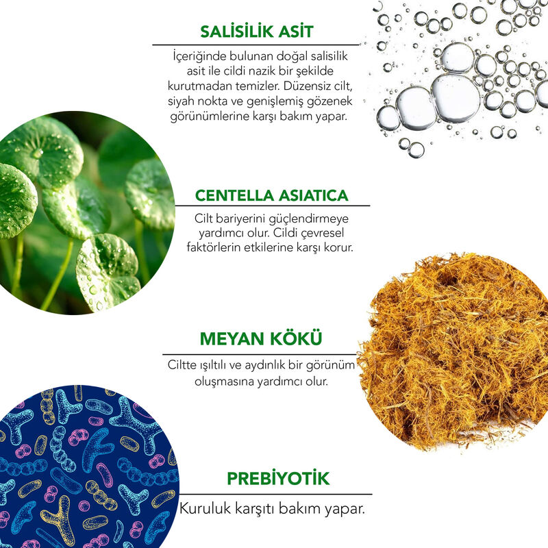 Aksöğüt ve meyan kökü ekstresi, gözeneklerde biriken kir ve yağı temizler. Siyah nokta oluşumuna karşı bakım yapmaya yardımcı olur. Aloe vera ile cildi nemlendirir ve nazik bir bakım sunar.