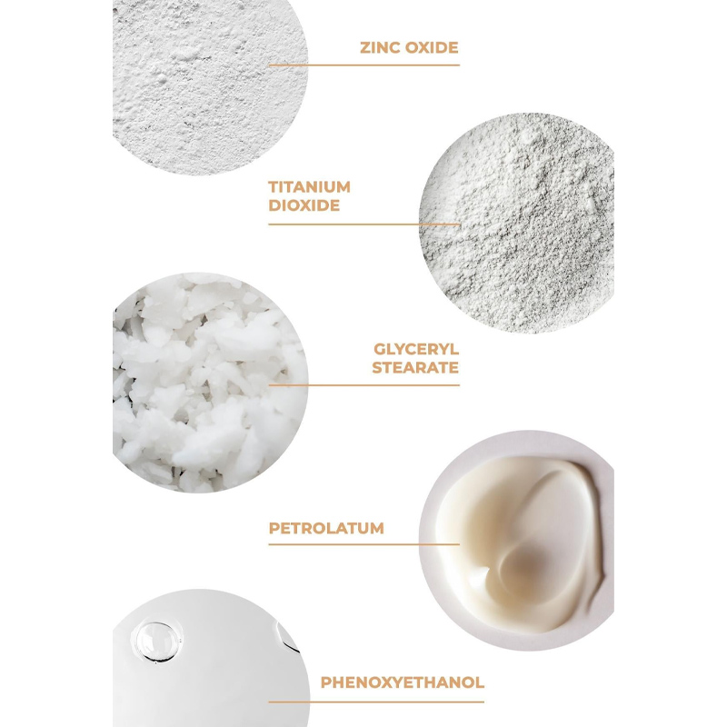 Aqua, Parafinium Liquidum, Glyceryl Stearate, Petrolatum, Zinc Oxide, Cetearyl Alcohol, Stearic Acid, Titanium Dioxide, Triethanolamine, Carbomer, Phenoxyethanol, Parfum, Ethylhexylglycerin, Geraniol, Citronellol.