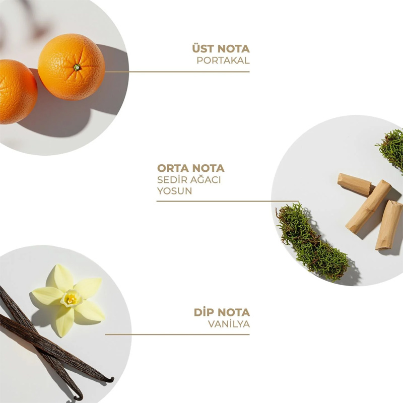 Portakal, Sedir Ağacı, Yosun, Vanilya Kokusu ile doğanın enerjisini ruhunuza taşıyan bir denge kurar.