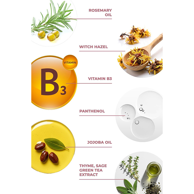 Aqua, Niacinamide, Panthenol, Salicylic Acid, Hamamelis Virginiana Extract, Sinum Usitatissium Seed Extract, Allantoin, Simmondsia Chinensis Seed Oil, Salvia Officinalis Leaf Extract, Thymus Vulgaris Leaf Extract, Lavandula Angustifolia Extract, Rosmarinus Officinalis Leaf Extract, Green Tea Extract, Caprylic/Capric Triglyceride, Phenoxyethanol, Ethylhexylglycerin, Sodium Benzoate, Potassium Sorbate, Rosmarinus Officinalis Leaf Oil.