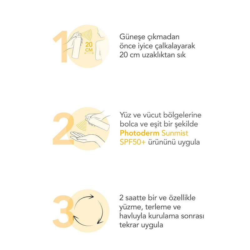 Photoderm Sun Mist SPF50+ transparan dokusu, hafif kokusu ve yayma gerektirmeyen mist formu ile yüksek güneş koruması sağlar. Suya, tere ve kuma karşı dayanıklıdır.