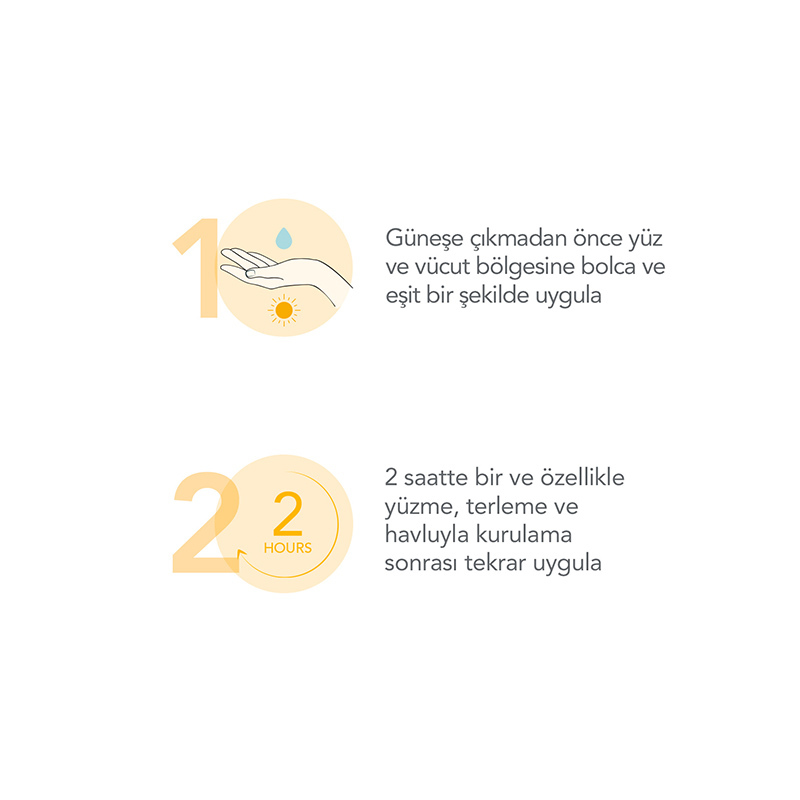 Güneşe çıkmadan önce yüz ve vücut bölgesine bolca ve eşit bir şekilde uygulayınız.