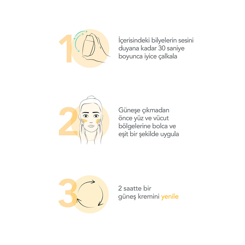 Güneşe çıkmadan önce bolca ve eşit bir şekilde uygulayınız.