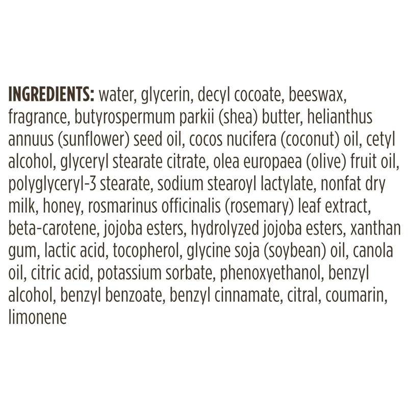 Aqua (Water), Decyl Cocoate, Glycerin, Helianthus Annuus (Sunflower) Seed Oil, Cera Alba (Beeswax), Parfum (Fragrance), Butyrospermum Parkii (Shea) Butter, Cetyl Alcohol, Glyceryl Stearate Citrate, Polyglyceryl-3 Stearate, Cocos Nucifera (Coconut) Oil, Olea Europaea (Olive) Fruit Oil, Vitis Vinifera (Grape) Seed Oil, Sine Adipe Lac (Nonfat Dry Milk), Mel (Honey), Aloe Barbadensis Leaf Juice, Rosmarinus Officinalis (Rosemary) Leaf Extract, Tocopherol, Beta-Carotene, Xanthan Gum, Sucrose Stearate, Glycine Soja (Soybean) Oil, Canola Oil, Lactic Acid, Citric Acid, Sodium Stearoyl Lactylate, Sodium Benzoate, Magnesium Aluminum Silicate, Phenoxyethanol, Benzyl Alcohol, Benzyl Benzoate, Benzyl Cinnamate, Citral, Coumarin, Limonene