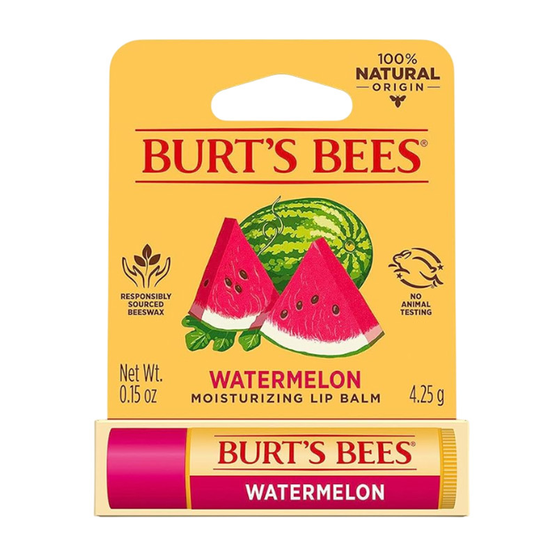 Dudakları nemlendirmeye yardımcı olan nemlendirici hindistan cevizi yağı ve balmumu içeren karpuzlu dudak balsamı.