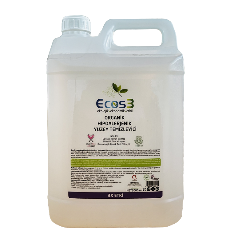 Adındaki "3", "Ekolojik, Etkili ve Ekonomik" olmasından gelir. Ecos3 temizlik ürünleri sadece evinizi ve kişisel eşyalarınızı temiz tutmaz, aynı zamanda hepimizin ve tüm canlıların evi olan dünyayı da korur ve daha temiz bir gelecek imkânı sunar. Ecos3 Temizlik Ürünleri; Kimyasal maddeler içermez, bitkisel bazlıdır ve biyo-çözünür. Doğada 40 gün içinde parçalanırlar. İnsan ve çevre dostudur. Fosfat, formaldehit, flor, amonyak, kresol, tuz, perkloretilen (C2Cl4) ve EDTA içermez. (Bu isimleri gördüğünüzde siz de kaçınız!) Su tasarrufu sağlar, geleceğimiz için suyu korur. Diğer temizlik malzemelerine göre 3 kat daha etkindir. Ekonomiktir. Hayvanlar üzerinde test edilmez, hayvanlara zarar verecek maddeler içermez. Ecos3 Hipoalarjenik Yüzey Temizleyici evinizdeki tüm yüzeylerde kullanabileceğiniz çevre dostu bir üründür. Yıkanabilir tüm yüzeylerde (karo, mermer, fayans, granit, marley) rahatlıkla kullanabilirsiniz. Kalıntı bırakmadan temizler ve uzun süreli hoş bir koku bırakır. Boya ve fosfat içermez, pH derecesi 7'dir (nötrdür.)!