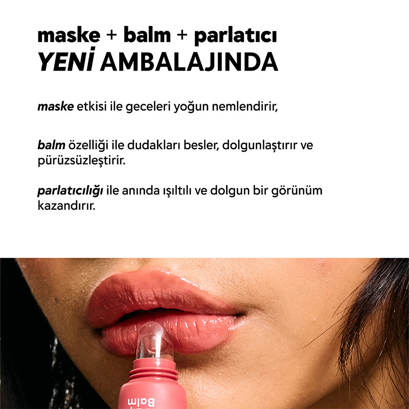 3in1, ipeksi ve yumuşak dudaklar için hyalüronik asit, seramid ve besleyici yağlar içeren; maske, balm ve parlatıcı olarak 3 etki 1 arada nemlendirici, renklendirici dudak balsamıdır.