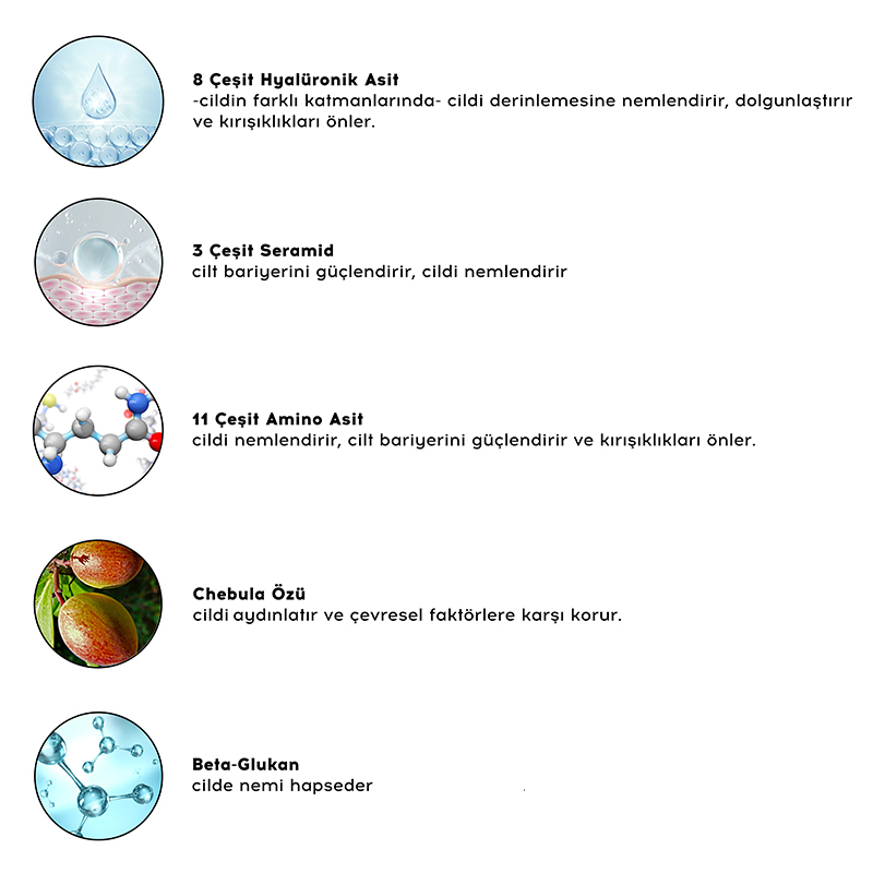 - Seramid cilt bariyerini güçlendirmeye yardımcı olur. Cildin nemlenmesini sağlar. Skualen cilt elastikiyetini arttırmaya yardımcı olur. Cildi nemlendirir ve cildin daha aydınlık ve ışıltılı görünmesini destekler.