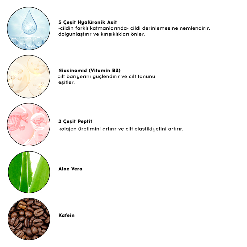 - Beş çeşit hyalüronik asit ile nemlendirir, peptitler ile kolajen üretimini destekler, niasinamid ile yağ dengesi sağlar ve kafein ile canlandırır.