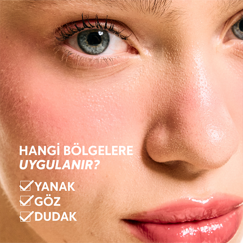 Sadece yanağına değil, tüm yüzüne ışıltı & renk katabilirsin! Dudaklarına ruj olarak, yanaklarına allık olarak ve gözlerine far olarak uygulayabilirsin.