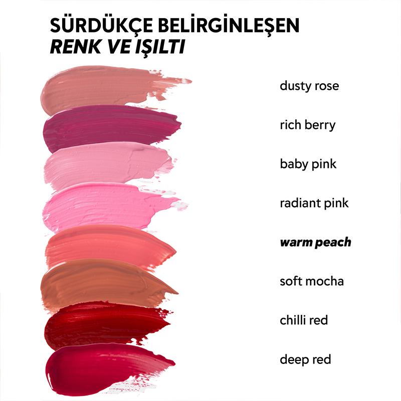 Sadece yanağına değil, tüm yüzüne ışıltı & renk katabilirsin! Dudaklarına ruj olarak, yanaklarına allık olarak ve gözlerine far olarak uygulayabilirsin.