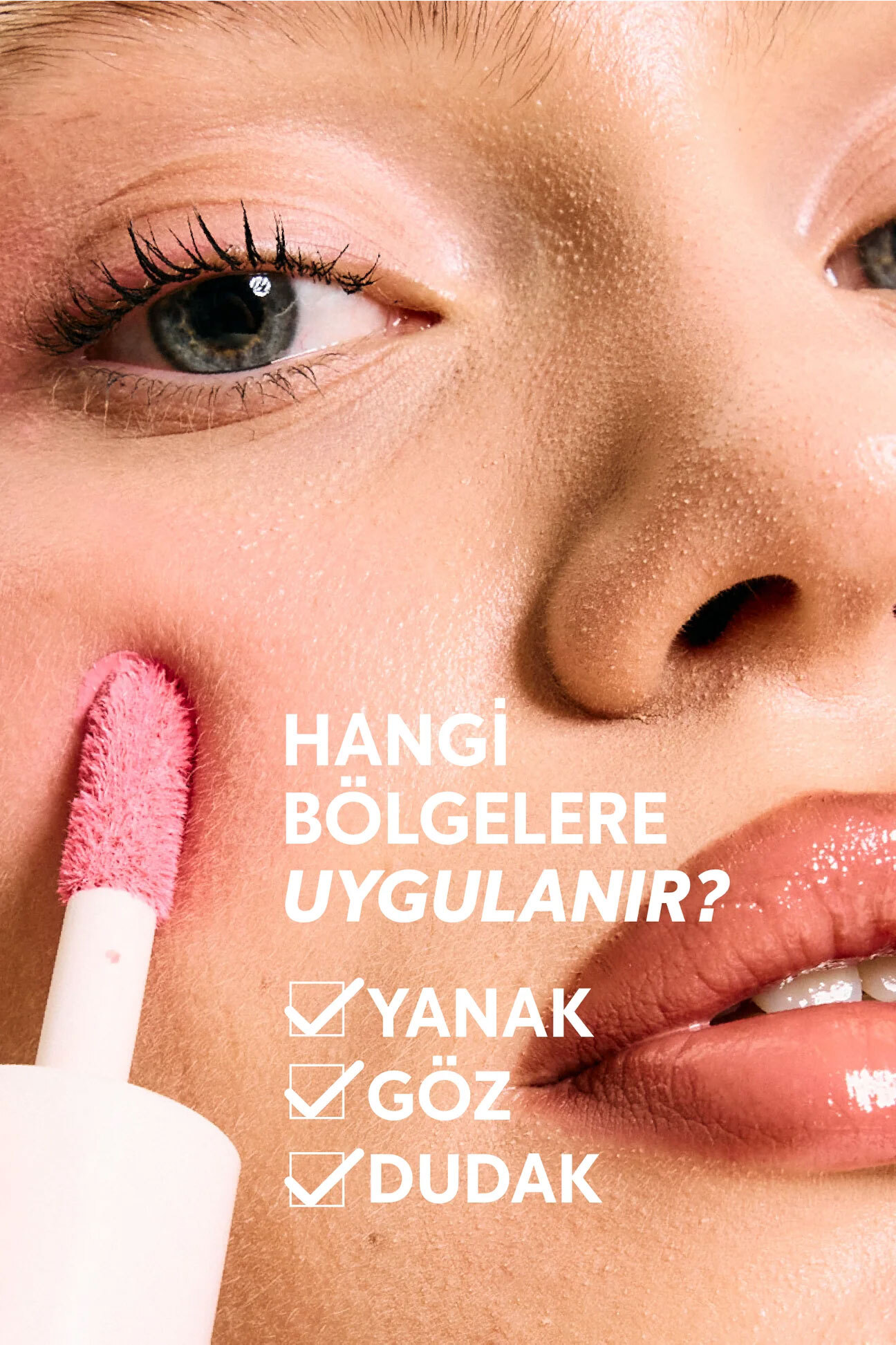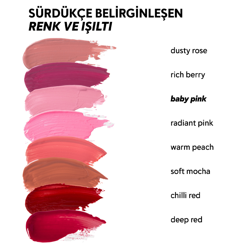 Sadece yanağına değil, tüm yüzüne ışıltı & renk katabilirsin! Dudaklarına ruj olarak, yanaklarına allık olarak ve gözlerine far olarak uygulayabilirsin.