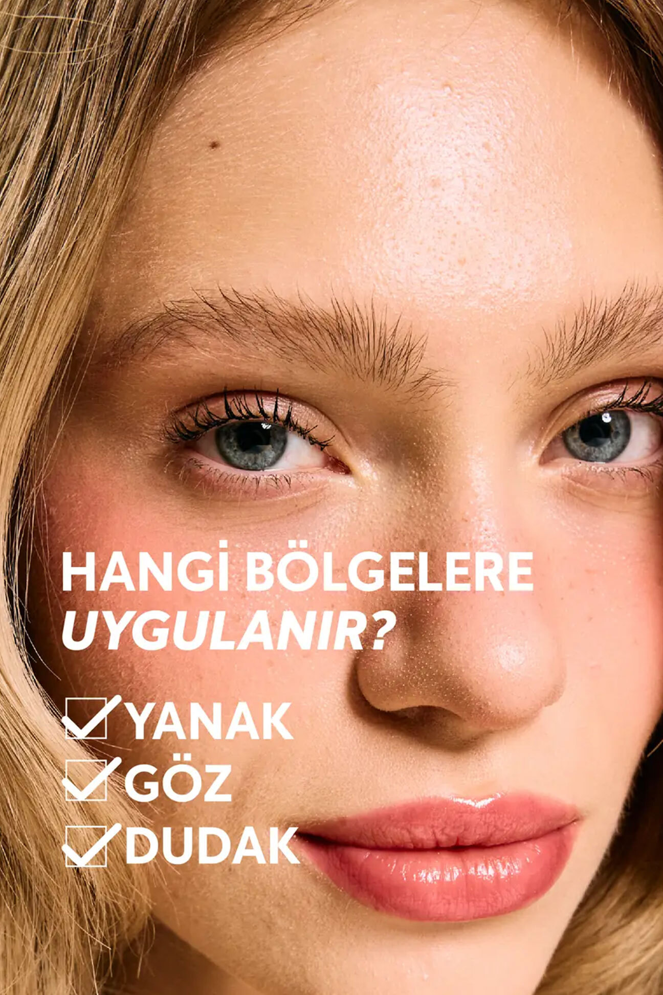 Sadece yanağına değil, tüm yüzüne ışıltı & renk katabilirsin! Dudaklarına ruj olarak, yanaklarına allık olarak ve gözlerine far olarak uygulayabilirsin.