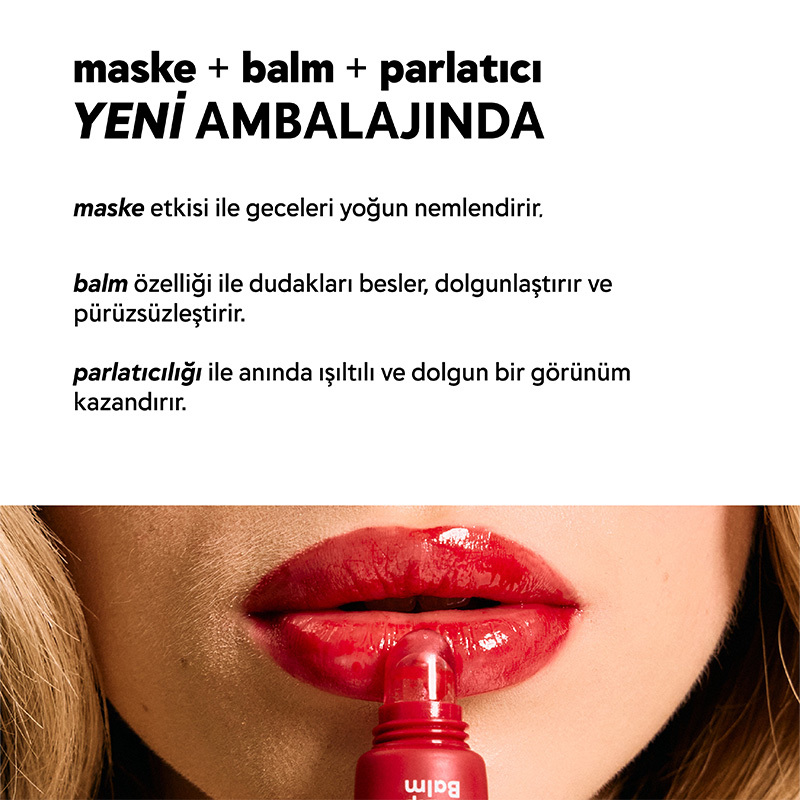 3in1, ipeksi ve yumuşak dudaklar için hyalüronik asit, seramid ve besleyici yağlar içeren; maske, balm ve parlatıcı olarak 3 etki 1 arada nemlendirici, renklendirici dudak balsamıdır.