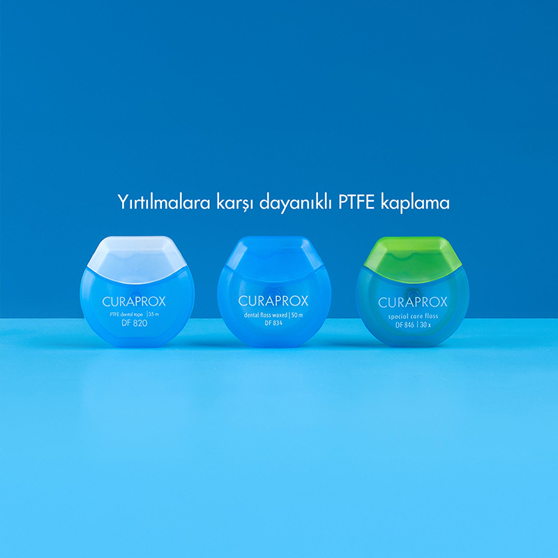DF 820 Diş ipi yüzeyinin telfon kaplı olması nedeni ile diş aralarındaki sıkı kontaklardan çok kolay bir şekilde giriş sağlar. Ayrıca güçlü diş ipi yapısı sayesinde kopmalara karşı oldukça dayanıklıdır.