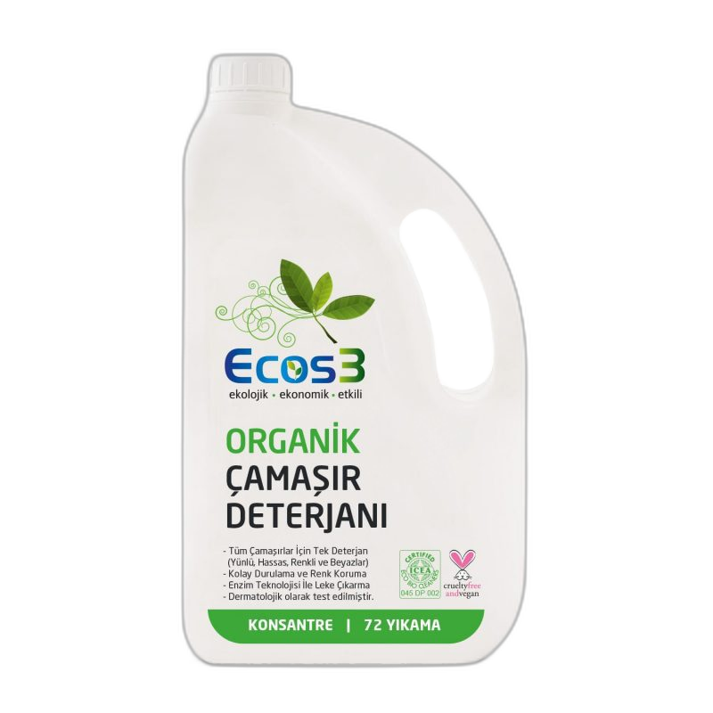Adındaki "3", "Ekolojik, Etkili ve Ekonomik" olmasından gelir. Ecos3 temizlik ürünleri sadece evinizi ve kişisel eşyalarınızı temiz tutmaz, aynı zamanda hepimizin ve tüm canlıların evi olan dünyayı da korur ve daha temiz bir gelecek imkânı sunar. Ecos3 Temizlik Ürünleri; Kimyasal maddeler içermez, bitkisel bazlıdır ve biyo-çözünür. Doğada 40 gün içinde parçalanırlar. İnsan ve çevre dostudur. Fosfat, formaldehit, flor, amonyak, kresol, tuz, perkloretilen (C2Cl4) ve EDTA içermez. (Bu isimleri gördüğünüzde siz de kaçınız!) Su tasarrufu sağlar, geleceğimiz için suyu korur. Diğer temizlik malzemelerine göre 3 kat daha etkindir. Ekonomiktir. Hayvanlar üzerinde test edilmez, hayvanlara zarar verecek maddeler içermez. Ecos3 Sıvı Çamaşır Deterjanı lekeleri kolayca çıkarır, çamaşırların içine işleyerek kiri ve kötü kokuyu yok eder. Çamaşırları yıpratmaz, renkleri korur. Düşük ısılarda etkilidir, hassas ve yünlü çamaşırlar için uygundur. Hoş bir çiçek kokusu bırakır.