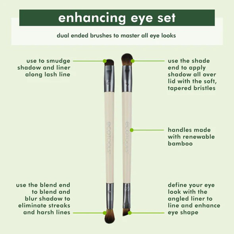 EcoTools Eye Enhancing Duo Set, makyaj çantanızda yer tasarrufu sağlamak ve uygulama pratikliğini artırmak amacıyla tasarlanmış yenilikçi bir fırça setidir. Çift taraflı özel tasarımı sayesinde, sadece 2 fırça gövdesinde göz makyajının tüm aşamaları için gerekli olan 4 farklı fırça başlığını bir arada sunar. Sürdürülebilir bambu sapları, geri dönüştürülmüş alüminyum bilezikleri ve vegan kılları ile hem doğaya duyarlı hem de yüksek performanslı bir makyaj deneyimi sağlamayı hedefler.