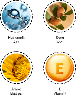 Hyaluronik Asit cildin nem tutma kapasitesini artırarak uzun süreli nem sağlar. Shea Yağı cildi besler, yumuşatır ve nemlendirir. Arnika Ekstresi cildi çevresel etkilere karşı korur ve taze tutar. E Vitamini ise dış etkenlerden kaynaklanan kuruluk hissine karşı destek sunar.