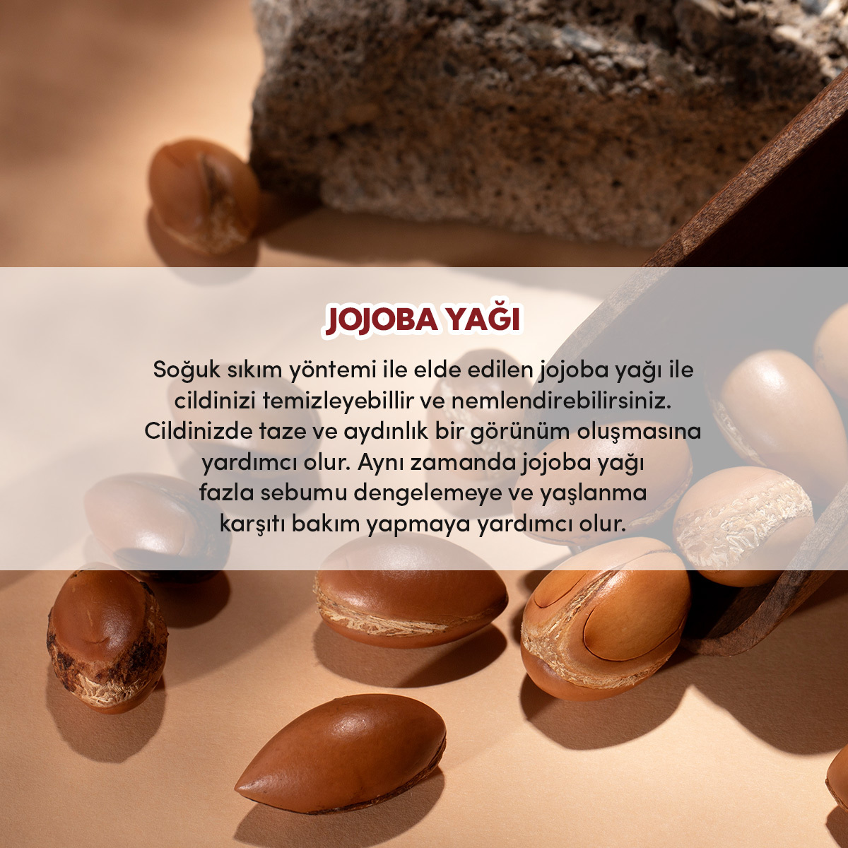 %100 saf jojoba çekirdeklerinden, soğuk sıkım yöntemiyle elde edilmiştir. Cildin doğal sebum yapısına benzerliği sayesinde hızlı emilir ve etkili bir bakım sunar. Cilde doğal ve ipeksi bir ışıltı kazandırırken cildin parlamasına yardımcı olur.