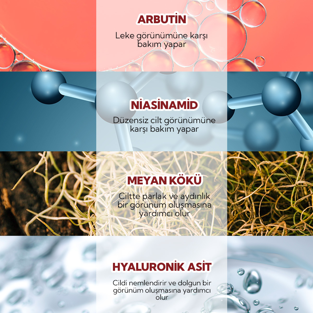 Arbutin ve Meyan kökü ekstresi içeriği ile cilde aydınlık bir görünüm sağlarken leke görünümüne karşı bakım sağlar.
