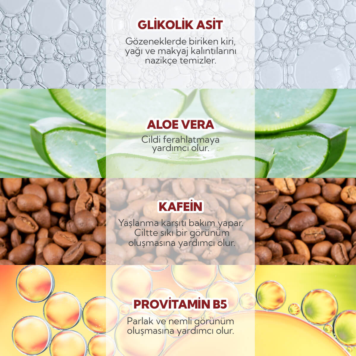 Dış etkenlere karşı cildi korumaya yardımcı olur. Aloe Vera sayesinde cildinizi ferahlatır. Kafein ile cildinize daha dinç, sıkı ve parlak bir görünüm kazandırır. Hafif köpük yapısı ile kolayca uygulanır ve cildinizi nazikçe temizlerken aynı anda parlak, pürüzsüz ve tazelenmiş bir görünüm elde etmenizi yardımcıdır.