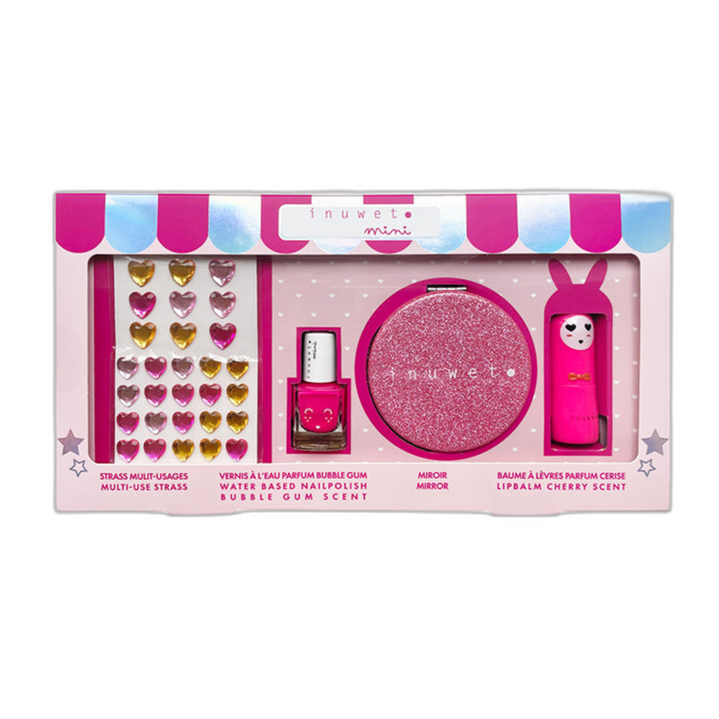 Inuwet, çocuklara özel bir hediye seti sunuyor: Su bazlı, fuşya renkli ve çilek kokulu çocuk ojesi Hafif pembe tonlu, kiraz kokulu besleyici dudak balmı Cep aynası Yüz ve vücut için taşlar ve simler Minikleri çok mutlu edecek, tam bir kız çocuklarına özel hediye seti!