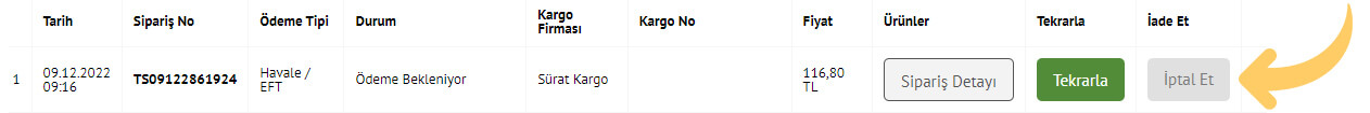 Siparişinizi tamamen iptal etmek ve işlemi geri almak isterseniz siparişten hemen sonra Siparişlerim sayfasından iptal işlemini gerçekleştirebilirsiniz. İşleme girmiş siparişleri iade etmek için yine Siparişlerim sayfasını kullanarak iade işlemlerini başlatabilirsiniz.
