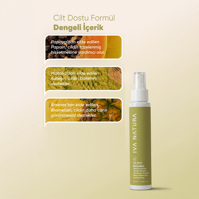 Matcha ve bitkisel içeriklerle geliştirilen bu tonik sprey, cildi gün içinde ferahlatmaya ve nem dengesinin korunmasına yardımcı olur.