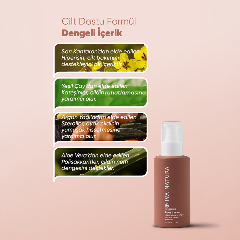 Kantaron yağı ve shea yağı içeren bu ayak bakım kremi, kuruluk yaşayan ayakların nem dengesini destekleyerek daha yumuşak ve konforlu bir his oluşmasına yardımcı olur.