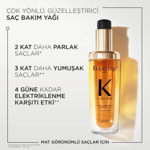 C: Saç yağları saçınızın daha güçlü, daha yumuşak ve daha parlak görünmesine yardımcı olabilir. Ayrıca saçları dış etkenlere karşı korur. Elixir Ultime, ısılı saç şekillendirme aletlerinin neden olduğu hasarlara karşı saçları koruma altına alır."