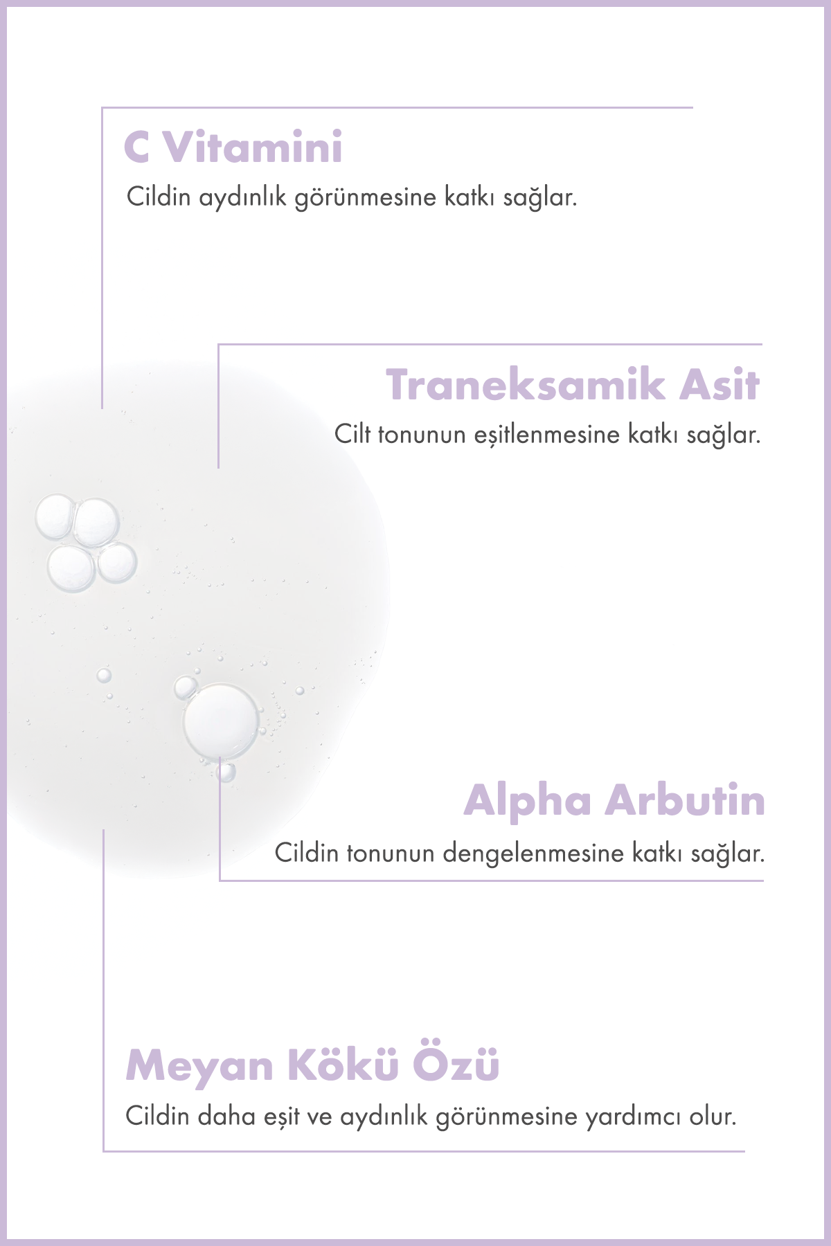 Tranexamic Acid, Alpha Arbutin ve C vitamini içeren bu aydınlatıcı serum, cilt görünümünün dengelenmesine yardımcı olur. Zengin içerikleri sayesinde cildin daha pürüzsüz görünmesine katkıda bulunur.