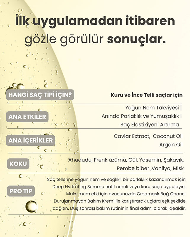 Anında nem, parlaklık ve ipeksi his verir; kopmaları azaltmaya yardımcıdır. |