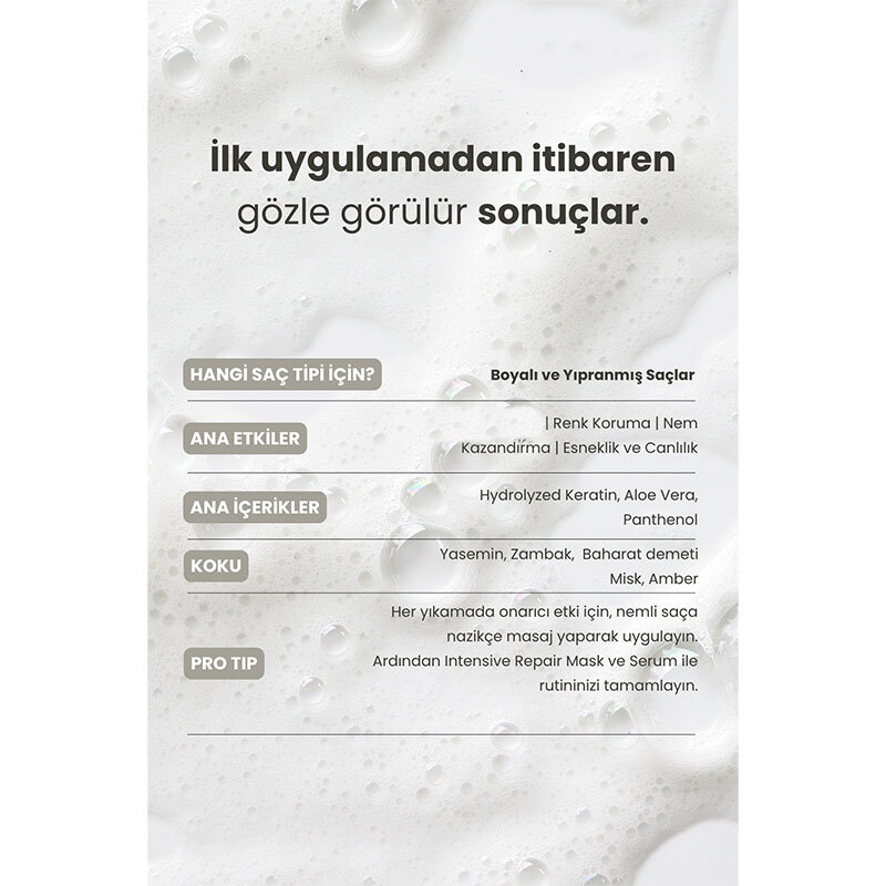 | Ek Özellikler | Zengin köpüğüyle arındırır, saçı onarıma hazırlar. | Renk koruması sağlar, saç elastikiyetini artırır. | Anında parlaklık, ipeksi görünüm ve kolay tarama etkisi sunar. |