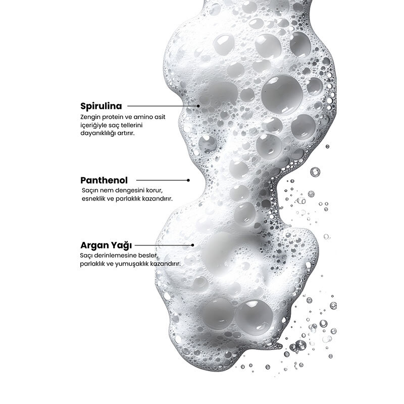 Saçlarda parlak ve pürüzsüz bir görünüm oluşmasına yardımcı olmak için Spirulina, Argan ve Panthenol aktifleri ile tasarlanmıştır.