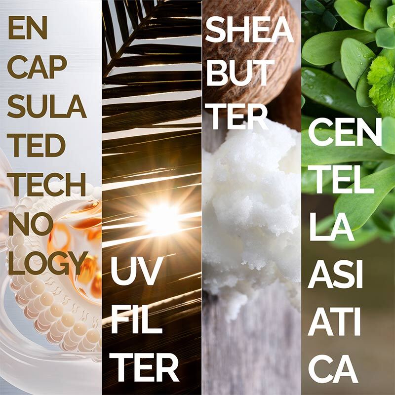 Aqua, Titanium Dioxide/CI 77891, Glyceryl Stearate, Caprylic/Capric Triglyceride, Glycerin, C12-15 Alkyl Benzoate, Cyclopentasiloxane, Propylene Glycol, Dicaprylyl Carbonate, Potassium Cetyl Phosphate, PEG-100 Stearate, Zinc Oxide, Butyrospermum Parkii Butter, Diethylamino Hydroxybenzoyl Hexyl Benzoate, Ethylhexyl Triazone, Bis-Ethylhexyloxyphenol Methoxyphenyl Triazine, Panthenol, Dimethiconol, Sodium PCA, Phenoxyethanol, Ceteareth-20, Dimethicone, VP/Eicosene Copolymer, Propanediol, Mica, Sodium Acrylates Copolymer, Lecithin, Hydrolyzed Glycosaminoglycans, Sodium Hyaluronate, Hydrolyzed Hyaluronic Acid, Hyaluronic Acid, Sodium Hyaluronate Crosspolymer, Scenedesmus Rubescens Extract, Pentylene Glycol, Talc, Tocopheryl Acetate, Parfum, Xanthan Gum, Glycine Soja Seed Extract, Ethylhexylglycerin, Tetrasodium EDTA, Centella Asiatica Leaf Extract, Butylene Glycol, Ceteareth-12, Cetearyl Alcohol, Cetyl Palmitate, Polyhydroxystearic Acid, Bisabolol, Hydroxyacetophenone, Chlorphenesin, Sodium Stearate, Cellulose Gum, Raspberry Ketone, Potassium Sorbate, Sodium Polyacrylate, Benzyl Glycol, Calcium Chloride, Citric Acid, CI 77492, CI 77491, CI 77499.