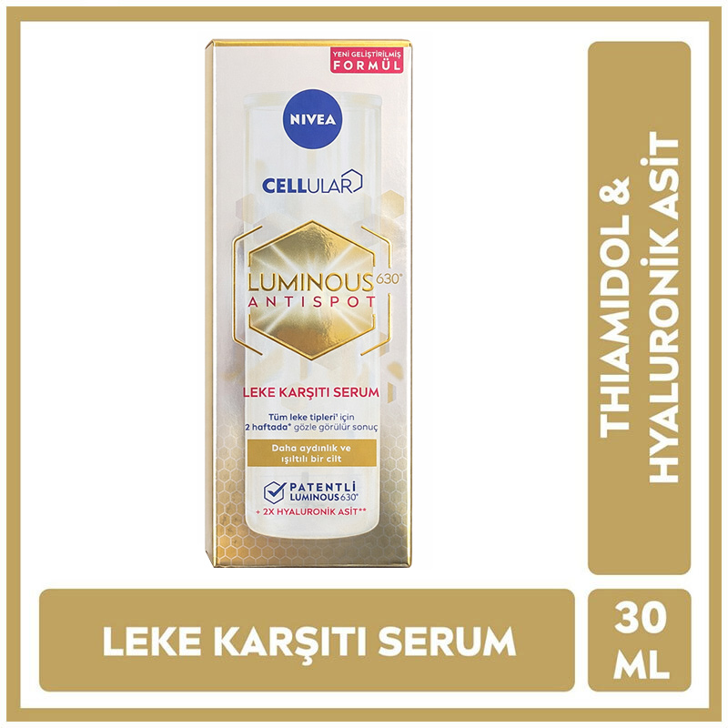 • NIVEA Luminous630 Leke Karşıtı Cilt Serumu 30ml: Patentli Thiamidol ile ilk günden itibaren koyu leke görünümüne karşı bakım yapar.