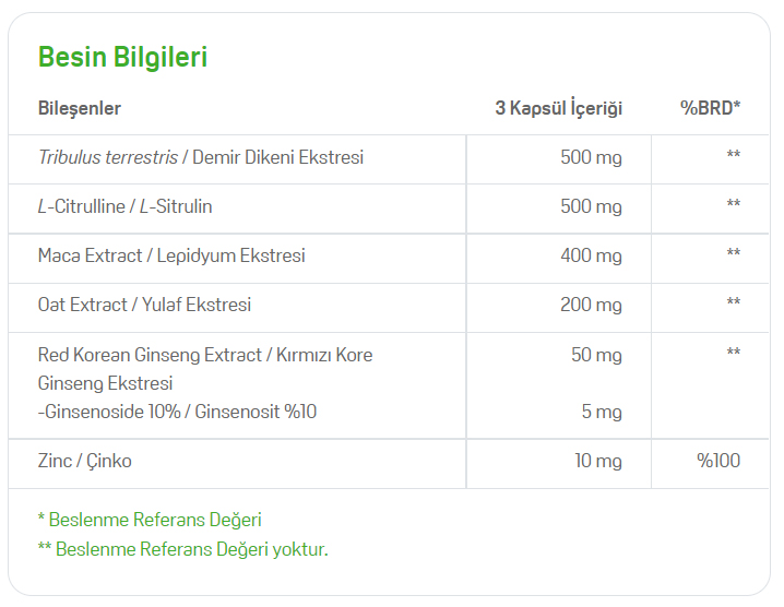 | Tribulus terrestris / Demir Dikeni Ekstresi | 500 mg | ** |