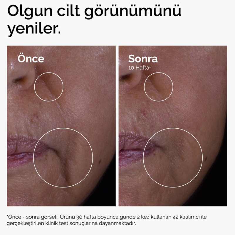 Kaz ayağı, alın çizgileri ve gülümseme çizgileri de dahil olmak üzere ince çizgi ve kırışıklık görünümünü azaltmaya yardımcı olarak olgun cildi destekler.