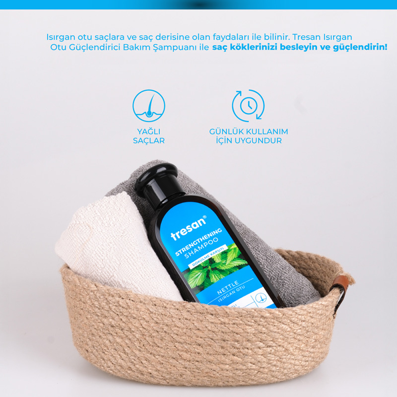 Yağlı saçlar için önerilen Tresan Isırgan Otu Güçlendirici Bakım Şampuanı saçı hacimlendirir ve güçlendirir.