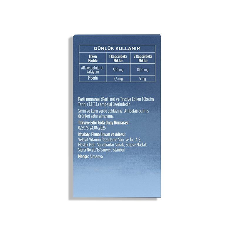Alfaketoglutarat-kalsiyum, Kapsül Bileşeni: Hidroksipropil metil selüloz, Topaklanmayı önleyici: Yağ asitlerinin magnezyum tuzları, Karabiber meyve ekstresi (Piperin*) *Piperin kaynağı olarak Bioperin® ticari markası kullanılmıştır.