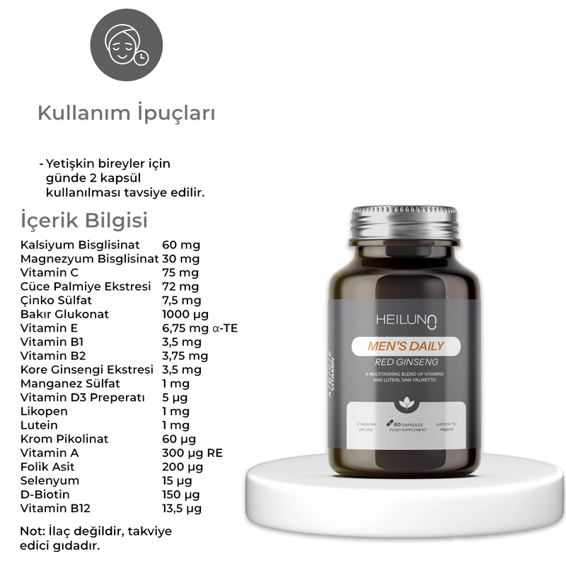(1 günlük porsiyon – 2 kapsül): Vitaminler: A, C, D, E ve B grubu vitaminleri Mineraller: Çinko, Selenyum, Magnezyum, Bakır, Manganez, Krom Bitkisel Ekstraktlar: Saw Palmetto, Likopen, Beta Glukan, Ginseng, Lutein