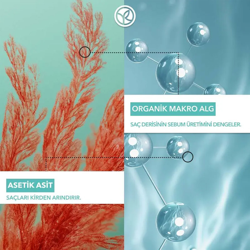 - Organik Okyanus Algi, saç derisini fazla sebumdan ve saçları çevresel faktörler kanaklı kirlilikten arındırır, detoks etkisiyle saçların daha hafif ve canlı bir görünüm kazanmasına destek sağlar.